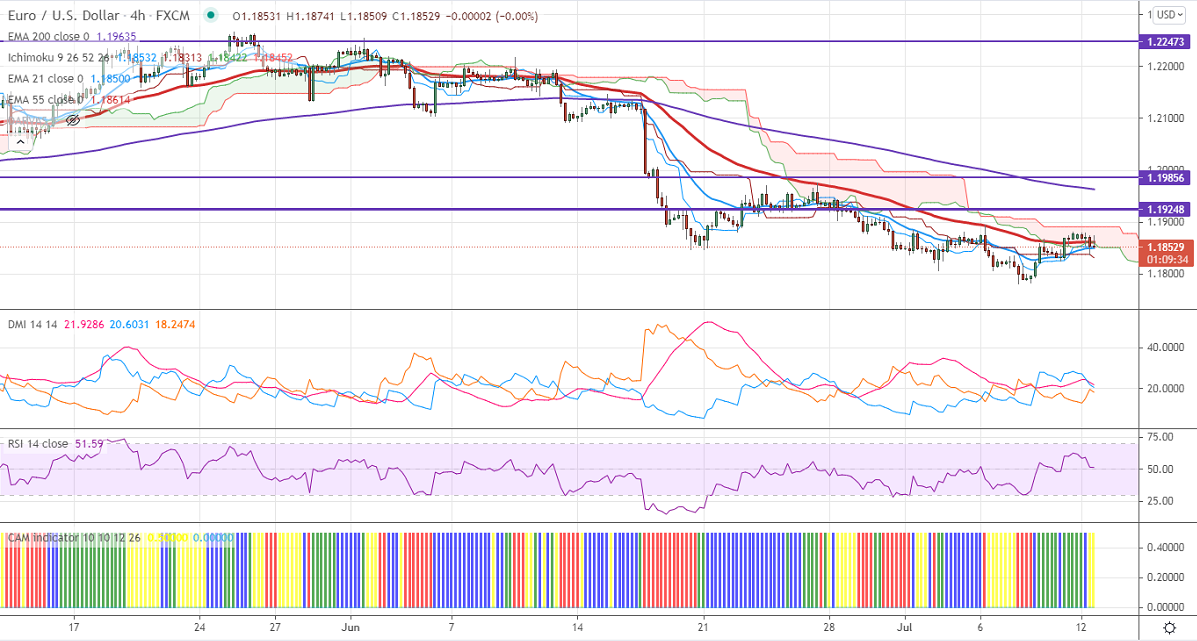 EURUSD is trading in a narrow range between 1.17813 and 1.18950 for the past four days. The dovish comments from ECB chairman Lagarde and spread of delta variant in major countries like the United kingdom etc. Markets eye US CPI data tomorrow for further direction. The US 10-year bond yield surged more than 10% from 4-1/2 month low 1.25%. EURUSD hits an intraday high of 1.18798 and is currently trading around 1.18556.