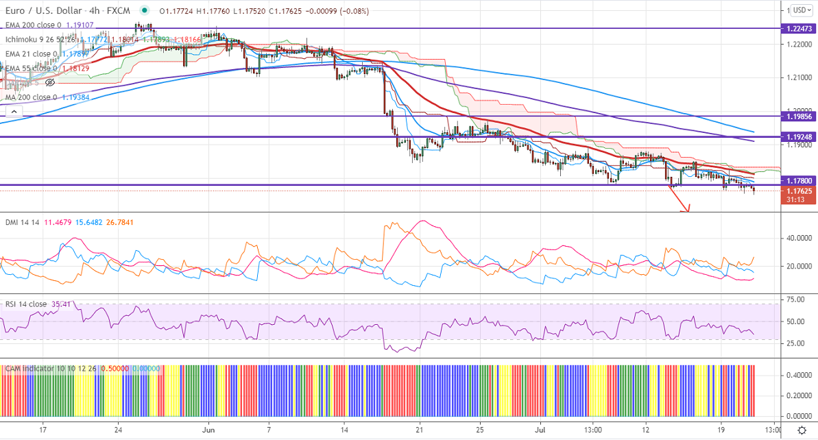 EURUSD hits three month low on board-based US dollar buying. The spread of delta variant coronavirus cases and hopes of dovish ECB is putting pressure on this pair. The average number of people who have been hospitalized in the US rose by 21% in the past 30 days. The pair hits an intraday low of 1.17520 and is currently trading around 1.17630.
