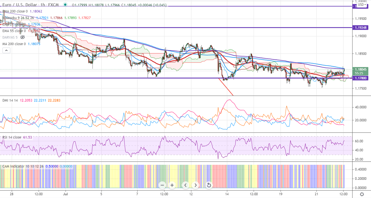 EURUSD is trading near its daily lows after the dovish ECB policy. The central bank has kept its rates unchanged as expected. It has allowed inflation to temporarily overshoot and revised its forward guidance on interest rates. The number of people who have filed for jobless benefits surged to 419k for the week ended July 16th compared to a forecast of 350K. The pair hits an intraday low of 1.17708 and is currently trading around 1.17630.