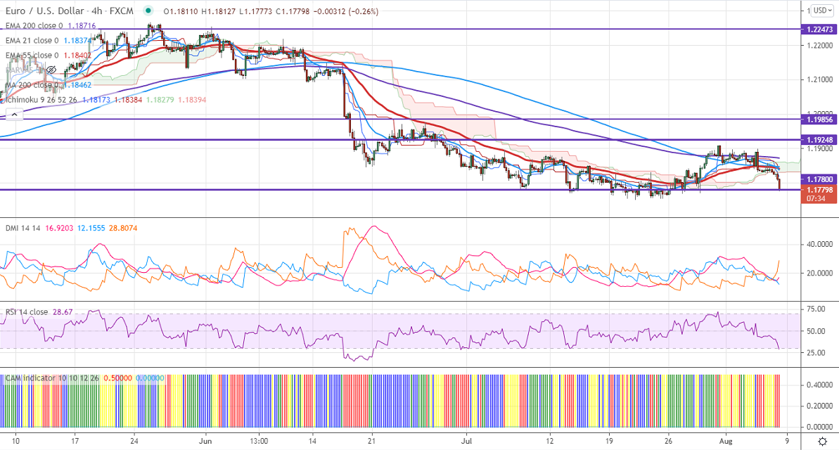 EURUSD declined sharply after upbeat US Non-farm payroll data. The US economy has added 943000 jobs in Jul compared to an estimated 870000. While unemployment came at 5.4% vs the forecast 5.7%.The average hourly earnings jumped to 0.4% above the forecast of 0.3%. The pair hits an intraday low of 1.17813 and is currently trading around 1.17901.