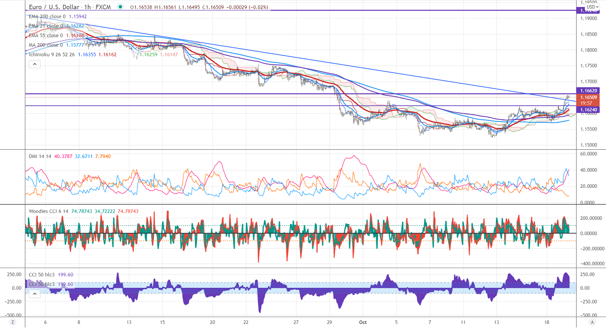 EURUSD pared most of its loss made the previous week and hits three weeks high at 1.16576. The upbeat market sentiment and declining US treasury yield is putting pressure on the US dollar index. US industrial production data dropped by -1.3% in Sep compared to a forecast of 0.30%. Markets eye US Housing starts and Fed member speech for further direction. It hits an intraday low of 1.15867 and is currently trading around 1.16530.