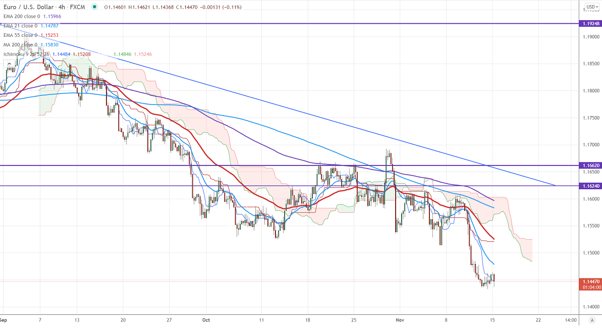 EURUSD recovered slightly from yearly lows on soft US dollar. The upbeat market sentiment and a virtual meeting between US Biden and Chinese Xi are supporting Euro. But Fed rate hike speculation is pushing US Treasury yields higher. Markets eye US empire state manufacturing index for further direction. EURUSD hits an intraday low of 1.14382 and is currently trading around 1.14387.