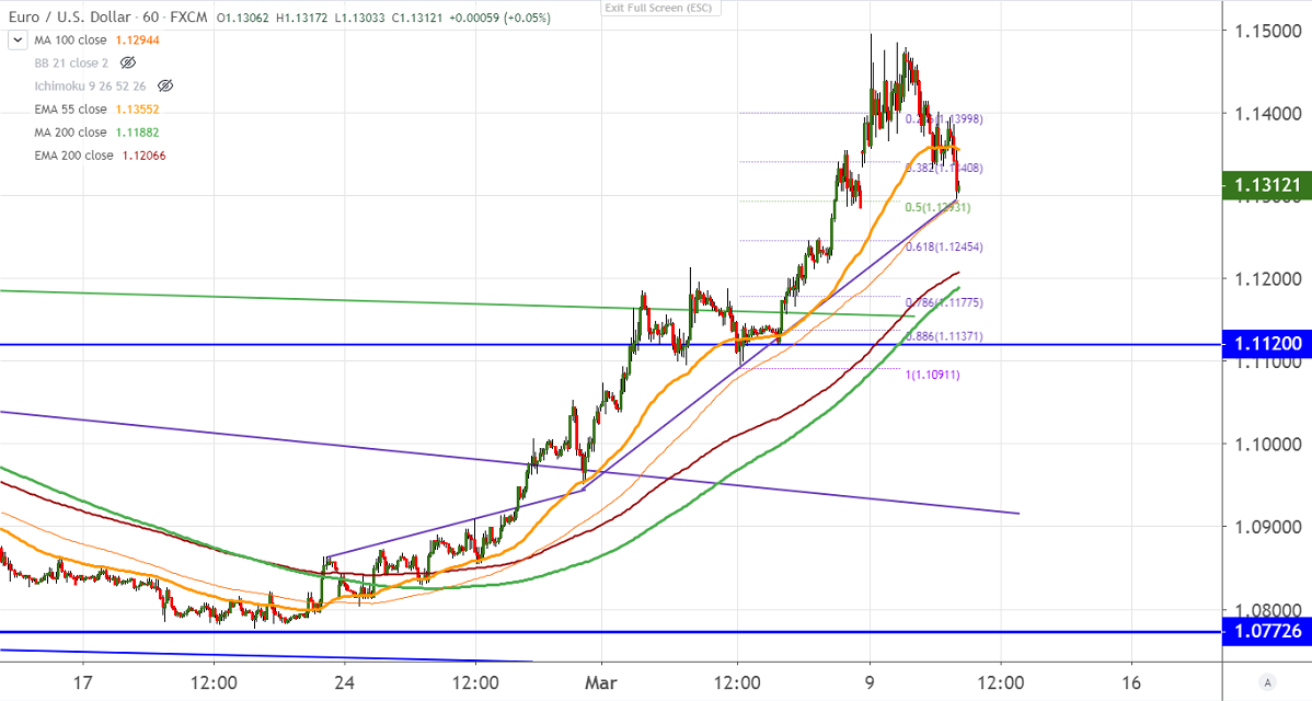 EURUSD declines sharply more than 150 pips from high as market mood slightly improved this morning. US futures have shown more than 5% jump after declining more than 7% yesterday. The pair hits intraday low of 1.13323 and is currently trading around 1.13068.