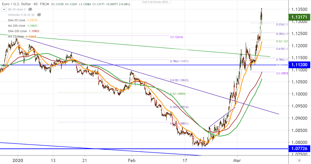 EURUSD has shown a minor decline after strong US Nonfarm payroll data. US economy has added 273000 in Feb vs forecast 175000, unemployment rate at 3.5% vs3.6% and average hourly earnings month on month at 0.3% vs 0.3% expected. The pair hits an intraday high of 1.13549 and is currently trading around 1.13253.