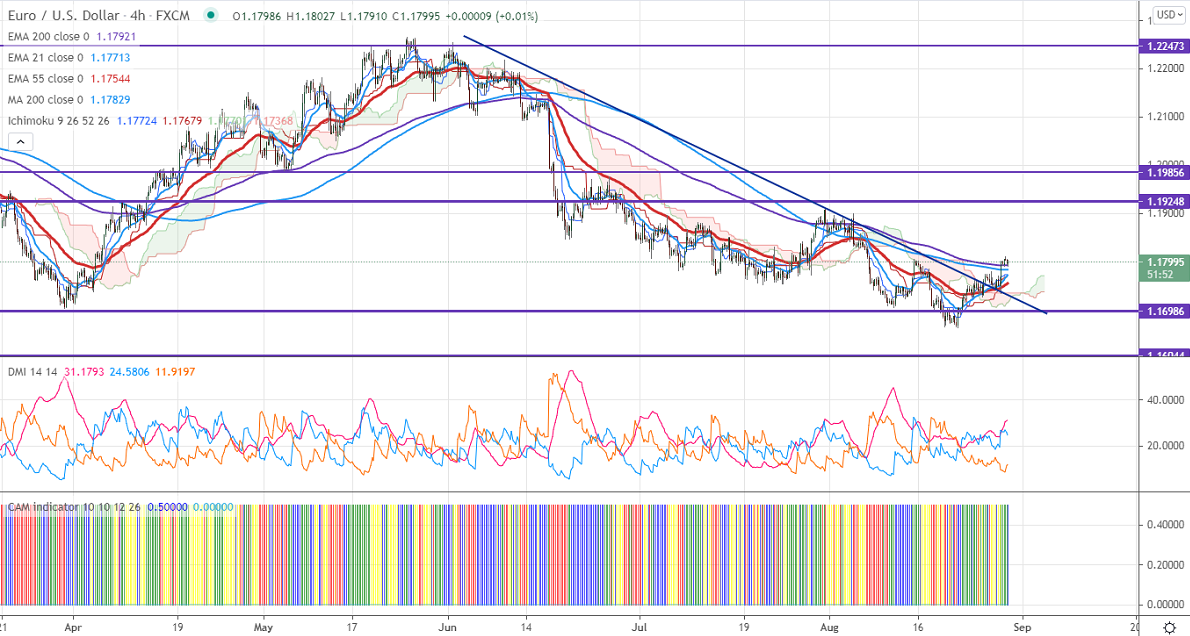 EURUSD hits three weeks high on Friday after dovish comments from Fed Chairman Powell. The speech gives hint that the central bank will be printing fewer dollars and to start tapering of bond-buying by this year's end. The US 10-year bond yield lost more than 4% after hitting a high of 1.375%. The spread of delta variants is preventing Euro upside.