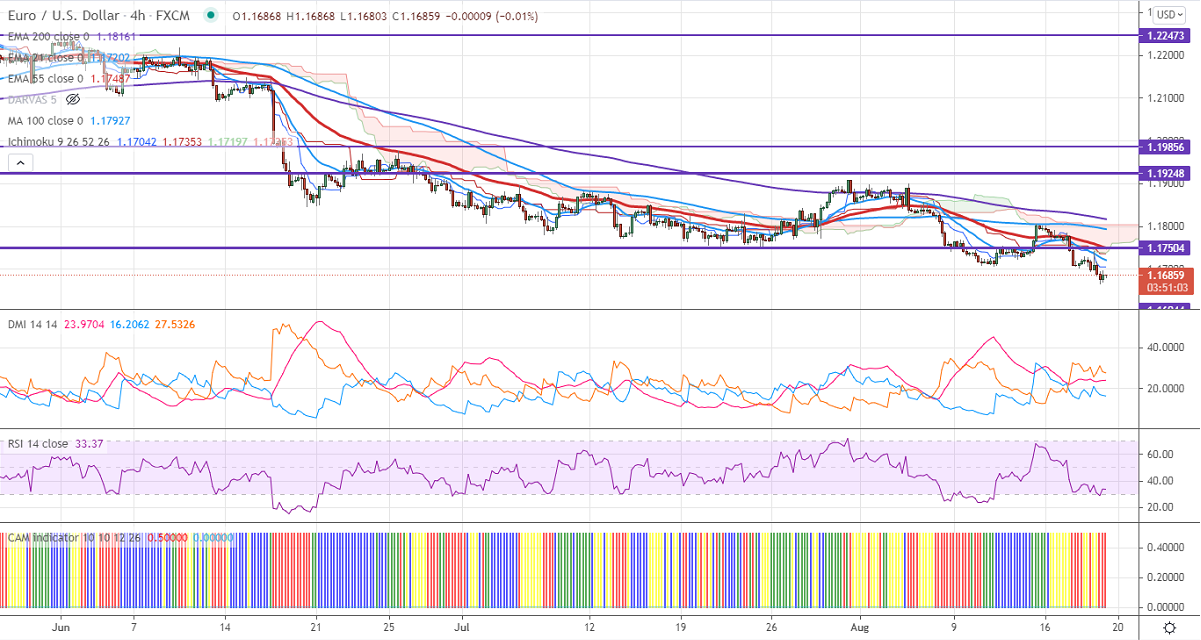 EURUSD declined below 1.11700 after Fed meeting minutes. It has signaled that the central bank to start tapering bond-buying by this year's end. The US dollar index reacted positively and hits a 4-1/2 month high. The rapid spread of Delta variant coronavirus and the Afghanistan political crisis also supporting the US dollar. Markets eye US Philly Fed manufacturing index and US initial jobless claims today for further direction. The pair hits an intraday low of 1.16658 and is currently trading around 1.16815.
