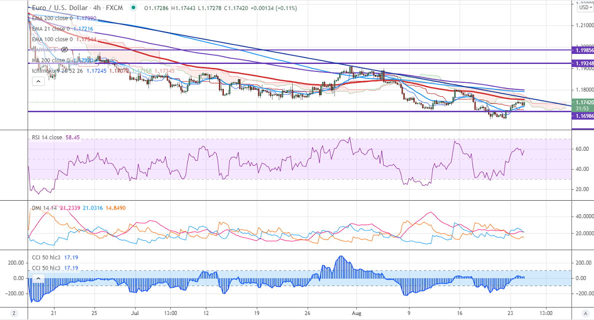 EURUSD recovered sharply from a 9-month low on risk-on mood. The approval of the Pfizer/BioNTech COVID vaccine and hopes of delay in Fed bond tapering is putting pressure on the US dollar. The US 10-year yield is consolidating after a major sell-off in the past two months. But Afghanistan's geopolitical tension and spread of delta variant coronavirus are preventing EURUSD from further upside. The pair hits an intraday low of 1.17443 and is currently trading around 1.17423.
