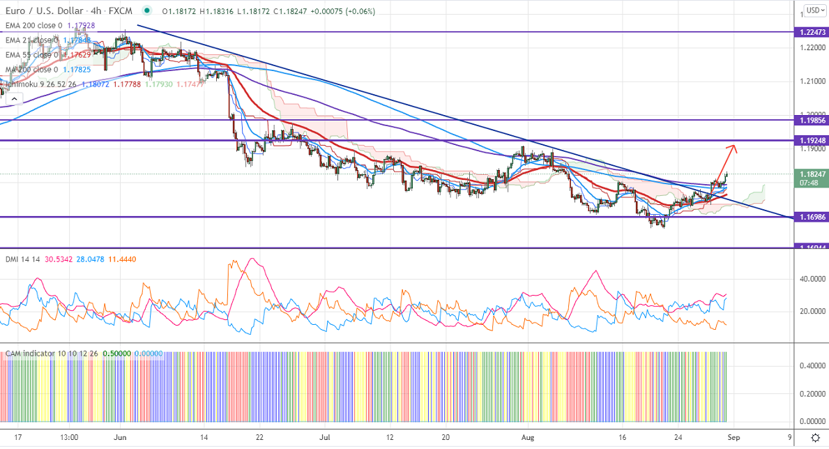 EURUSD hits a multi-week high and holding above 1.1800. The declining US treasury yields after dovish Fed Powell comments are putting pressure on the US dollar. The US dollar index trades below 200-4H MA, a dip till 92 is possible.