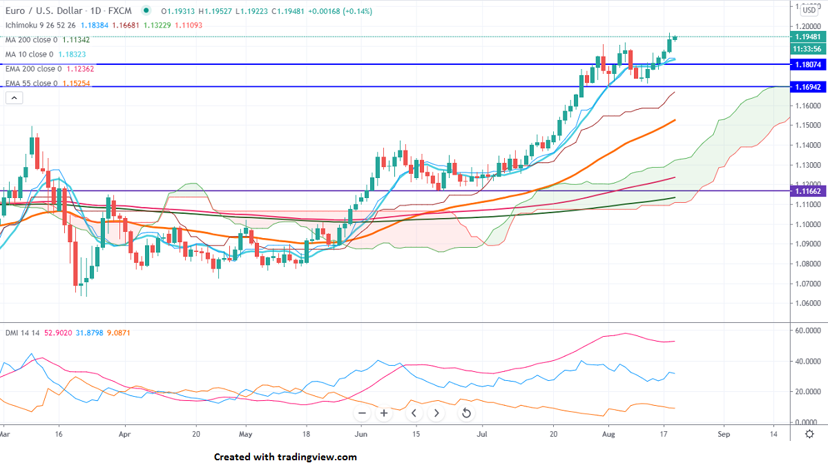 EURUSD is trading high for 6th consecutive days due to an increase in risk appetite. The minor dip in US yield after hitting 8-week high and delay in US stimulus package is putting pressure on the US dollar. Markets eye US Fed meeting minutes for further up move in this pair. The pair hits an intraday high of 1.19527 and is currently trading around 1.19465.
