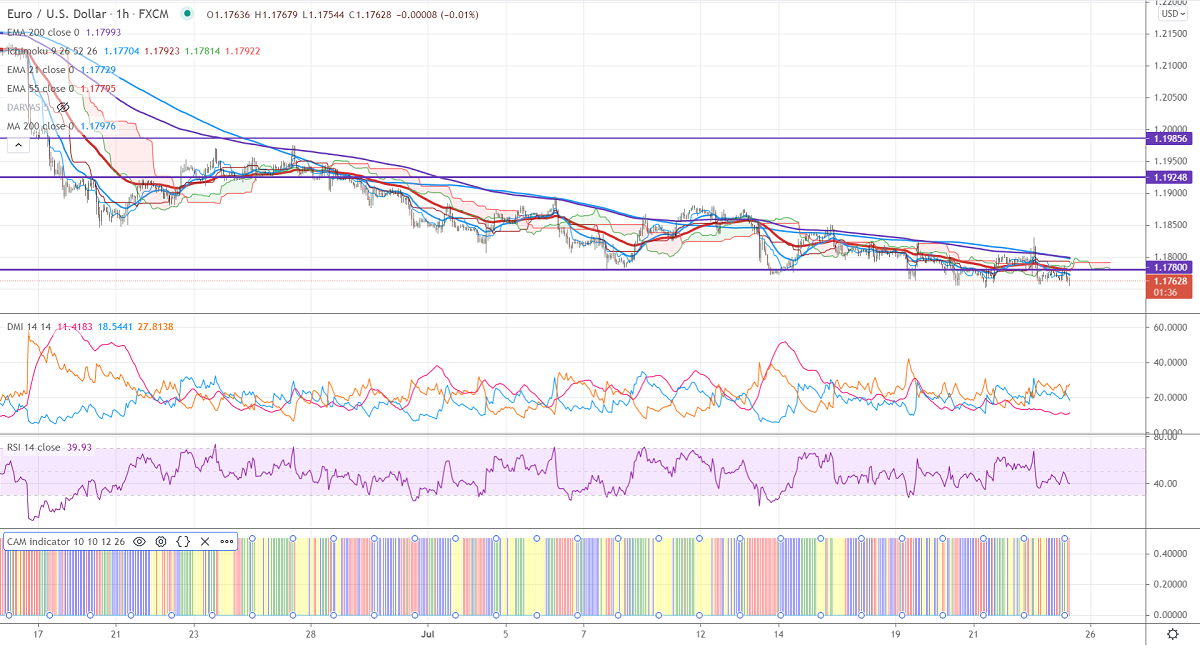 EURUSD is trading weak despite strong German PMIs. The services PMI came at 62.2 in Jul, the highest level since 1997. The dovish comment from ECB President is also putting pressure on Euro. Markets eye flash US services and manufacturing data for further direction. The pair hits an intraday low of 1.17544 and is currently trading around 1.17611.
