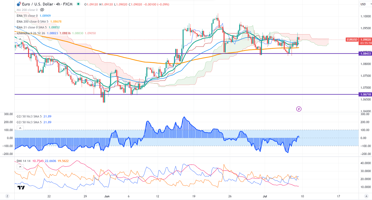 EURUSD showed a minor pullback on weak US jobs data. The US economy added 209000 jobs in June, the lowest since Dec 2020. The unemployment rate declined to 3.6% from 3.7%. Average hourly earnings jumped 0.40% m/m, above the forecast of 0.30%. It hits a low of 1.09313 at the time of writing and is currently trading around 1.09226.