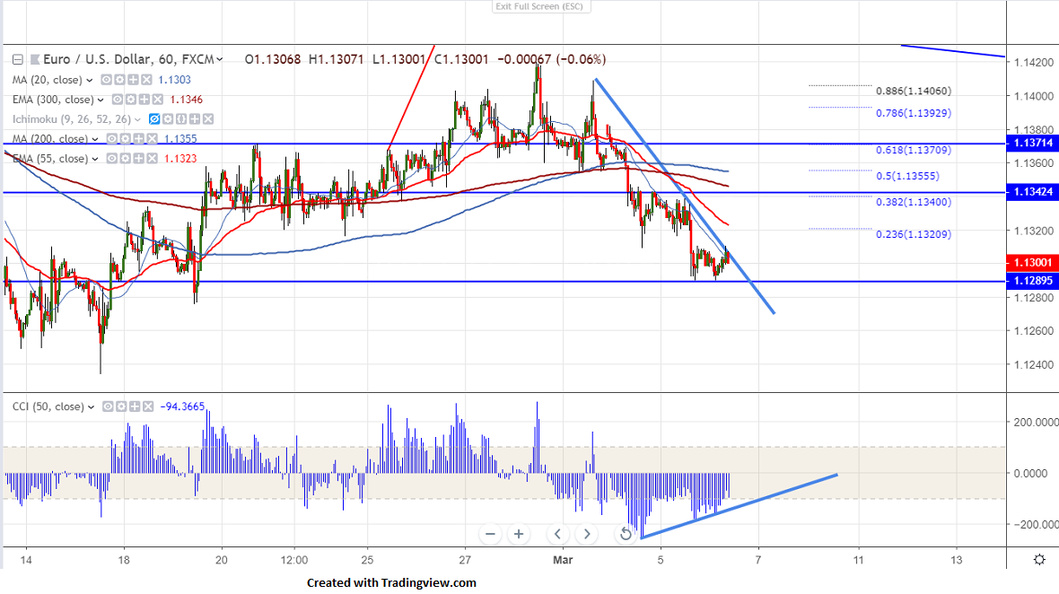 EURUSD pared minor gains made yesterday after release of better than expected US ISM non manufacturing data.US ISM non manufacturing data came at 59.7 in Feb compared to estimate of 57.3 The pair declined nearly 50 pips after the data and hits low of 1.12896. It is currently trading slightly above 1.1300 level.Markets eye US ADP employment data for further dirfection.
