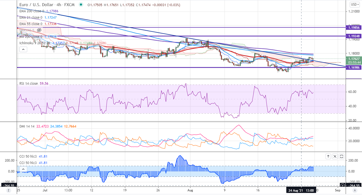 EURUSD is consolidating after a pullback of more than 50 pips from yesterday's low 1.17260. The US dollar recovered slightly ahead of the Jackson Hole symposium. The Fed Chairman is expected not to give any clue about fed tapering as several coronavirus cases surged in the U.S.