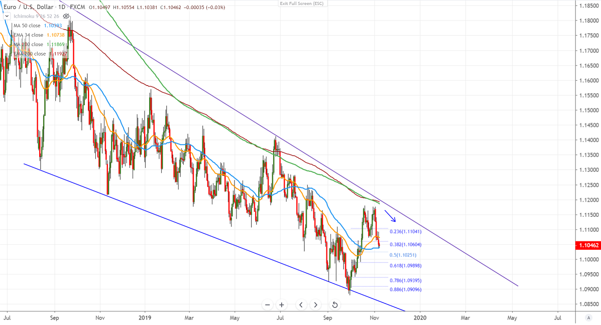 As per our analysis, EURUSD has formed Adam and Adam double top and is hold ing well below neckline 1.10700 level. The pair hits fresh 2-week low amid US-China trade optimism. The European Commission has slashed EU growth rate to 1.1% and 1.2% in 2019, 202 respectively compared to 1.2% and 1.5% in the previous forecast. The pair hits low of 1.10360 and is currently trading around 1.10418.