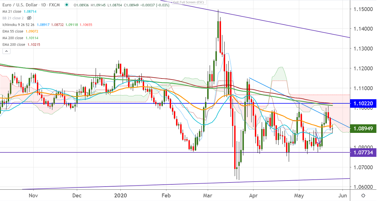 EURUSD showed a minor recovery above 1.0900 on upbeat German IFO data. It came at 79.5 in May better than the estimate of 78.3 vs 74.2 April month. The pair hits an intraday high of 1.09145 and is currently trading around 1.08928. But renewed US-Sino trade tensions and spread of coronavirus are supporting Safe-haven assets like US dollar and yen.