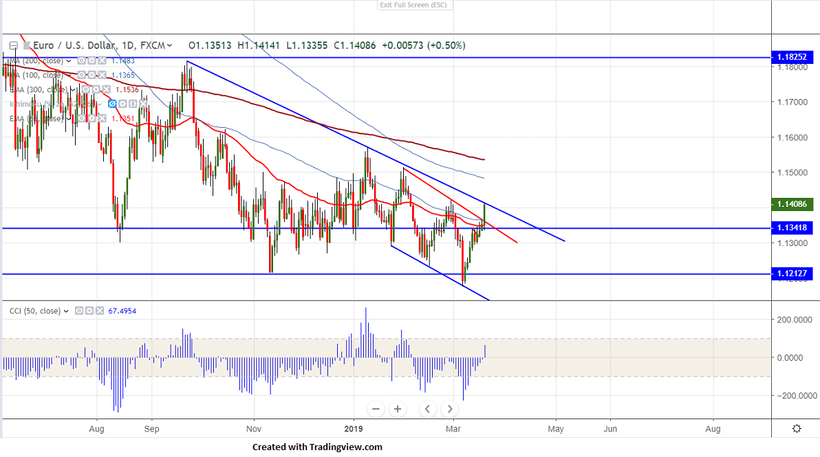 EURUSD trades higher and jumped more than 40 pips after Fed monetary policy. Fed has kept its rates unchanged as expected to downgraded growth forecast for Q1 to 2.6% form 2.9%. It hits intraday high of 1.14139 and is currently trading around 1.14119.