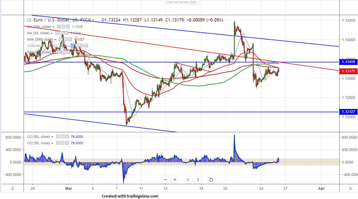 EURUSD trades steady above 1.1300 after a 3 days of selling. The pair has lost more than 170 pips from the high made after Fed policy. The pair hits low of 1.12732 shown a more than 60 pips jump on recovery of stock market . The recovery of in stock market mainly due to short covering and still global growth is cause of concern. Markets eye US conference board consumer confidence for further direction. It hits high of 1.13315 and is currently trading around 1.13150.