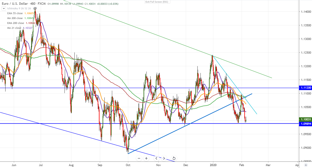 EURUSD is trading weak for the past 4 days after a minor jump till 1.10953. The upbeat US data, surge in global markets especially, S&P500 hits fresh all-time high as fear over Coronavirus faded is supporting dollar index. US private sector has added 291000 jobs in Jan compared to a forecast of 157000 vs 199000 in Dec (revised from 202000). US ISM services came at 55.5 in Jan, the highest level since Aug. It hits low of 1.099937 yesterday and is currently trading around 1.0030.