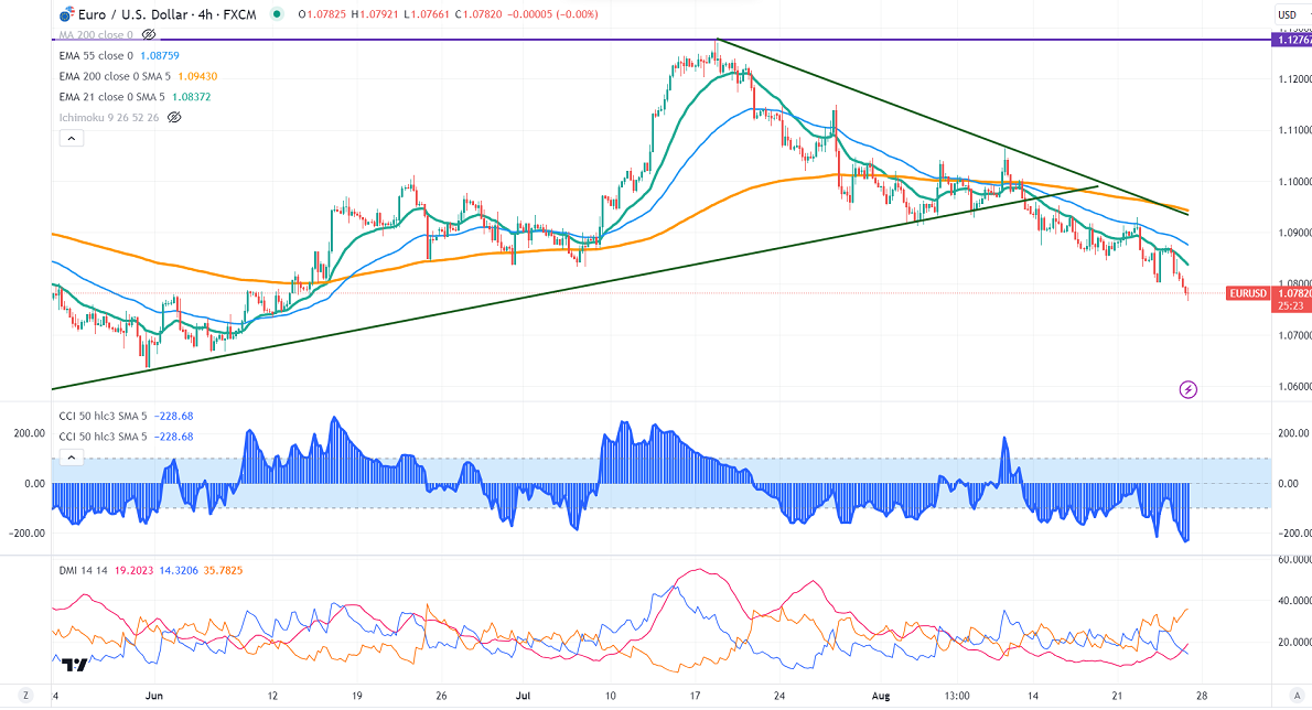 EURUSD hits a multi-week low on board-based US dollar buying. It hit a low of 1.07660 and is currently trading around 1.07792.
