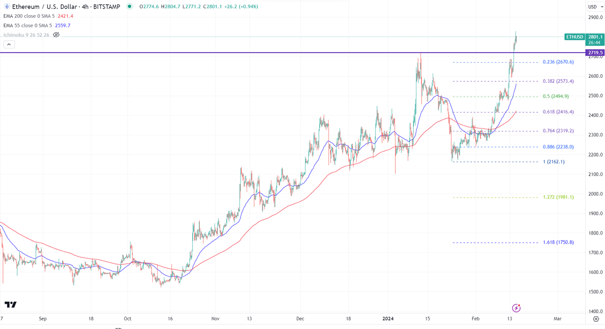 ETHUSD hits a fresh 2024 high, following in the footsteps of Bitcoin. It hit a high of $2828 at the time of writing and is currently trading around $2798.50.