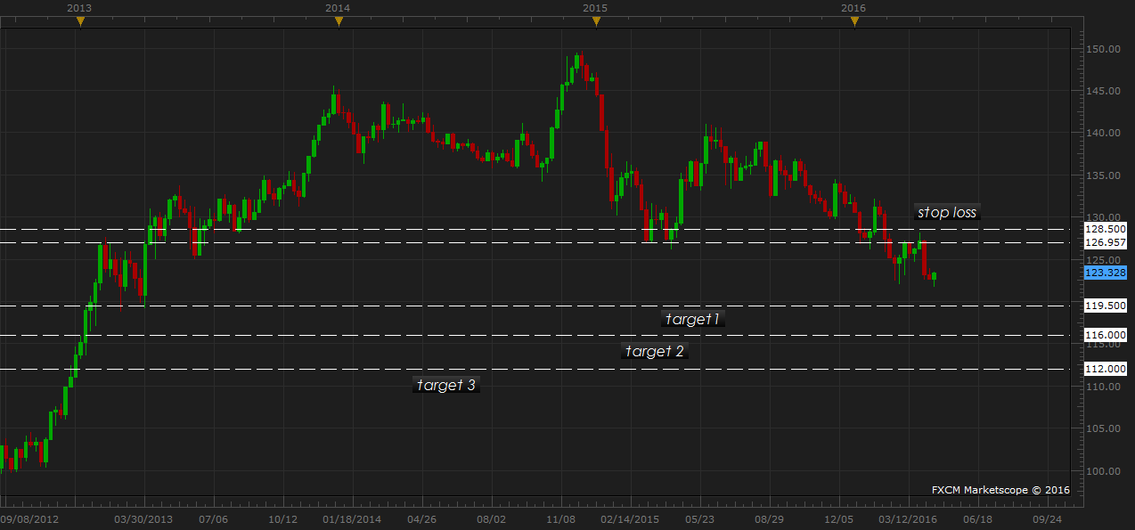 - Sell Euro, against Yen at current price of 123.5 and at rallies, targeting 119, 116 and 112 area with stop loss around 128.5.