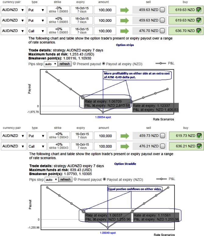 Hold 15D At-The-Money 0.50 delta call and simultaneously hold 2 lot of 1M At-The-Money -0.50 delta put options. Huge profits achievable with the strip strategy when AUDNZD exchange rate makes a strong move either upwards or downwards at expiration, with greater gains to be made with a downward move. From the diagram we can understand how the profitability can be maximized for every shift towards downside and this is not the same on upside.