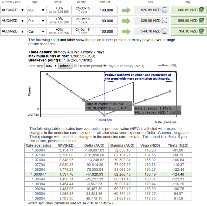 Hold 15D At-The-Money 0.50 delta call and simultaneously hold 2 lot of 1M At-The-Money -0.50 delta put options. Huge profits achievable with the strip strategy when AUDNZD exchange rate makes a strong move either upwards or downwards at expiration, with greater gains to be made with a downward move. From the diagram we can understand how the profitability can be maximized for every shift towards downside and this is not the same on upside.
