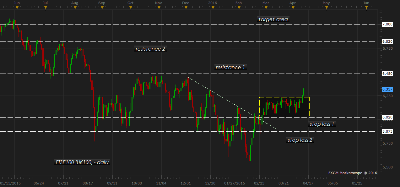 UK’s benchmark stock index may be aiming pretty higher from here, somewhere around 7000 area, according to the calculations from our model. FTSE is currently trading at 6320 area and yesterday it finally has broken above its recent consolidation range of 6000-6230 area.