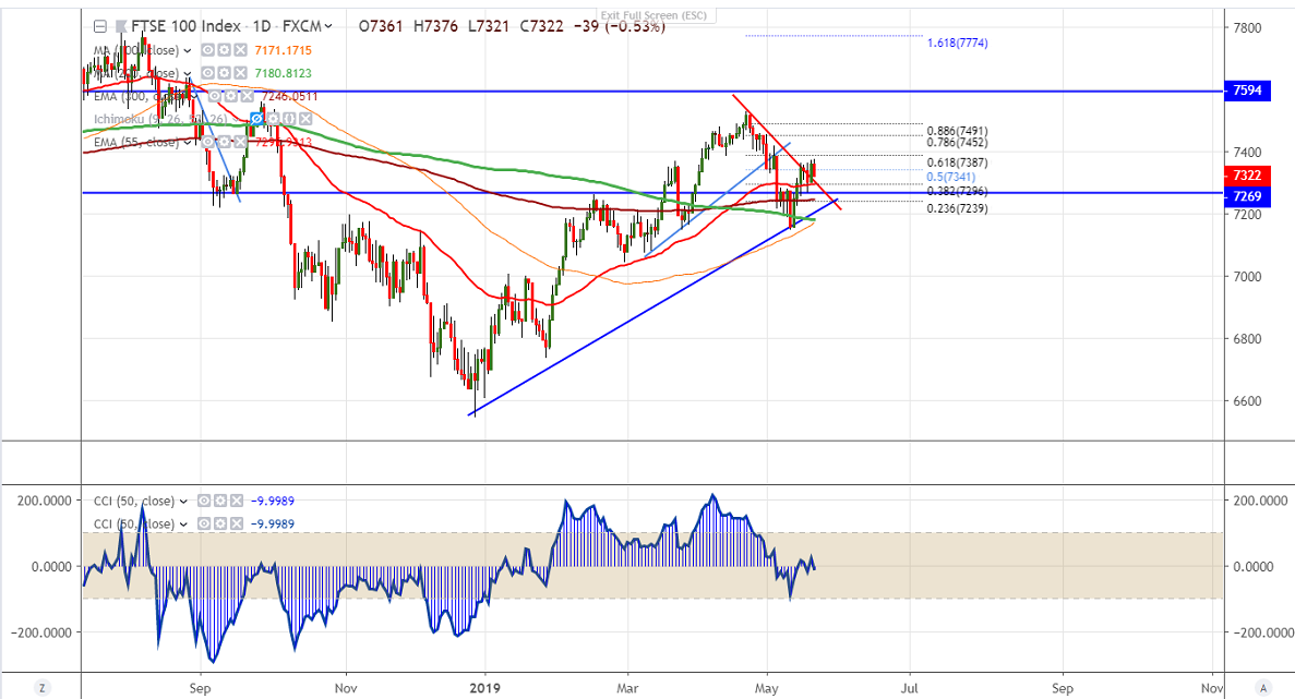 FTSE100 has broken high of 7363 made on May 16th after long consolidation on weak Pound sterling. GBP recovered sharply more than 100 pips after Theresa May offered new Brexit plan on Tuesday but MPs reacted negatively to UK PM’s last effort. GBP once again declined and hits 4-month low.UK CPI came at 2.1% yearly rate slightly better than expected compared to 1.9% previous.It hits high of 7372 and is currently trading around 7328.