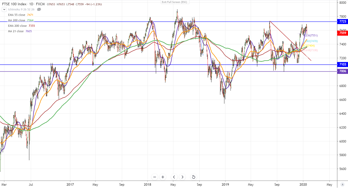 FTSE100 lost more than 100 points after a 1-1/2 month jump of more than 550 points. The rise was mainly due to strong global markets on the US-China trade deal. US markets were one of the best performers in the past 1-year especially S&P500 jumped more than 40%. The re-escalation of tension between the US and Iran is supporting Safe-haven assets like yen and gold. According to reports, three rockets have fallen near the US embassy in Baghdad's green zone.