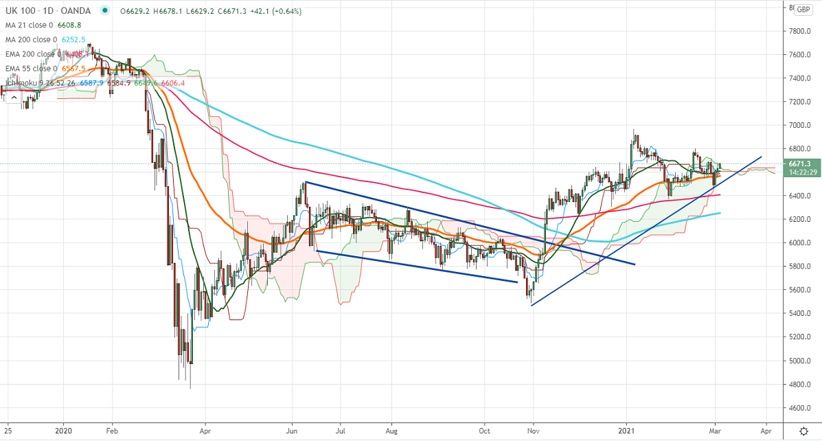 FTSE100 has taken support near 200- day EMA, shown a minor recovery of 200 points. The upbeat market sentiment due to coronavirus vaccine optimism and decline in the number of new cases is supporting the index at lower levels. Markets eye UK annual budget today for further direction. The index hits an intraday high of 6678 and currently trading around 6671.