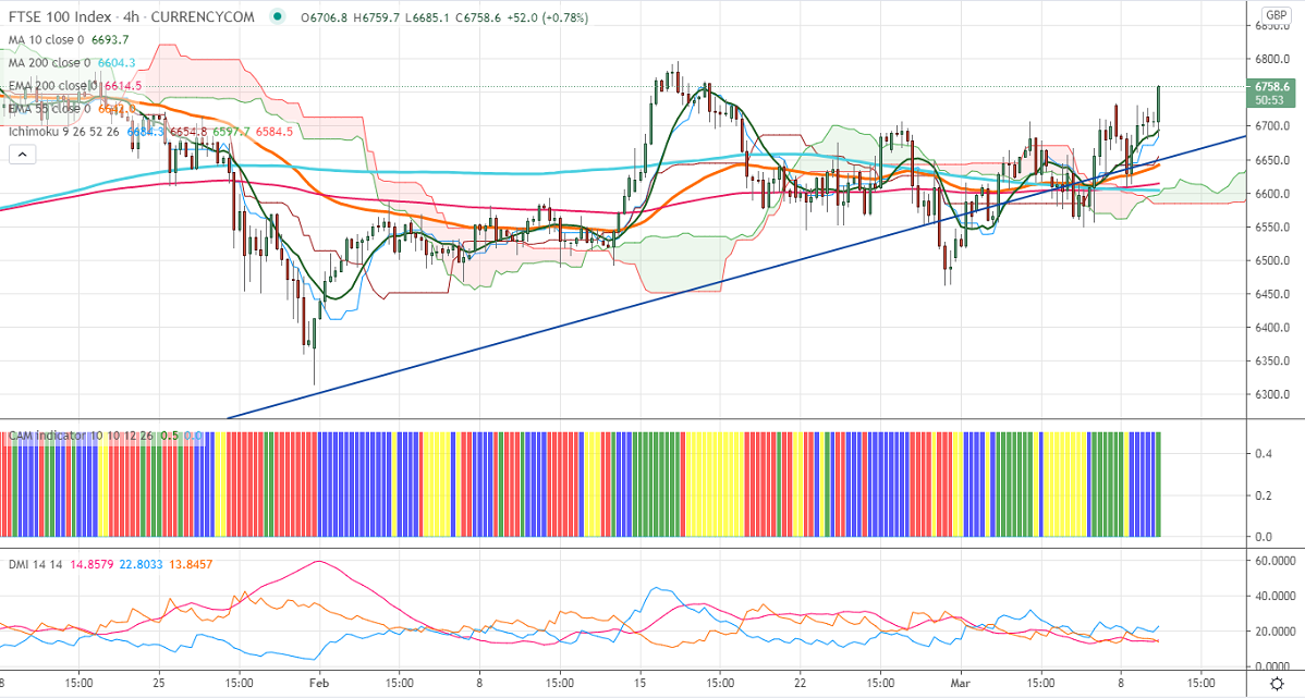 FTSE100 has recovered more than 120 points after hitting a low of 6608. The decline in pound sterling and easing of lockdown in the UK is supporting FTSE at lower levels. The surge in crude oil prices after major Saudi facility got attacked by drone helped BP and Shell to trade higher which is major components in FTSE100. The index hits an intraday high of 6755 and currently trading around 6754.80.