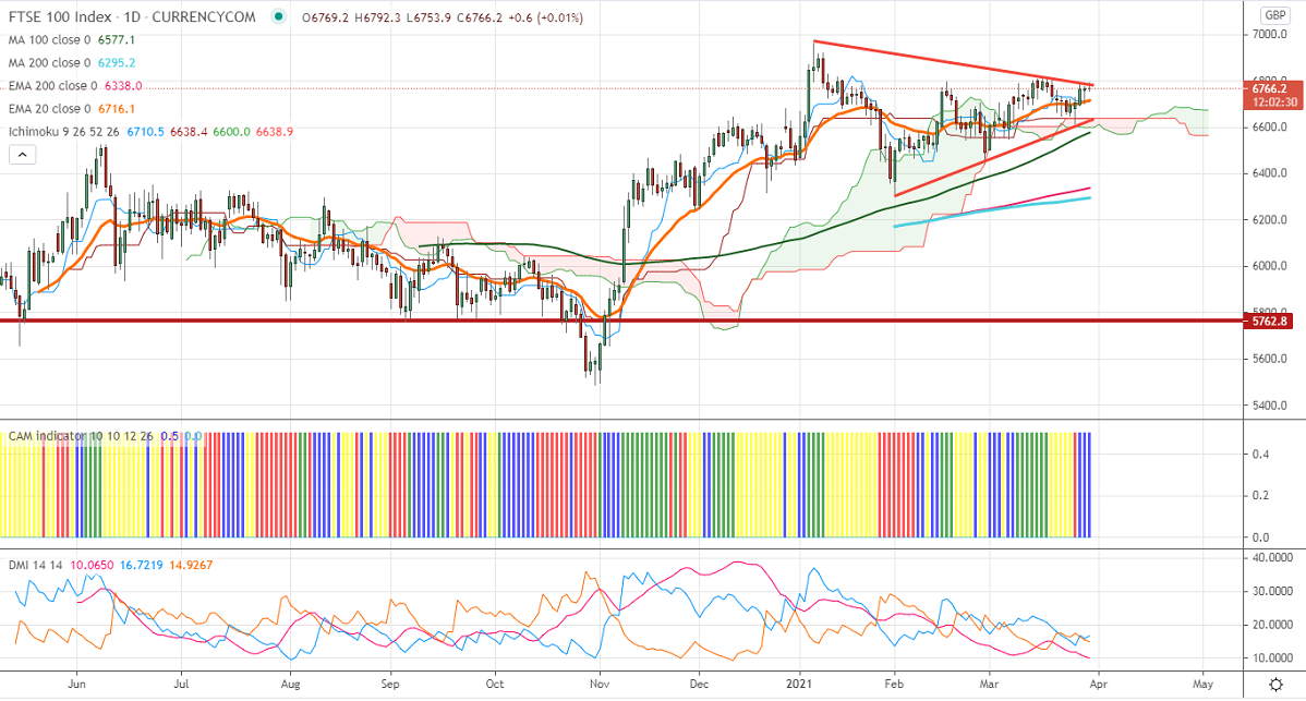 FTSE100 has taken support near 100-H MA and shown a nice recovery from that level. The upbeat market sentiment and positive US economic data are supporting global stock markets. S&P500 is trading higher and market valuations are well above the dot-com era. The lockdown has been imposed on major European countries like Germany, Poland, and France due to the third wave of the corona is preventing the stock markets from further upside. FTSE100 hits an intraday high of 6775 and currently trading around 6765.90.