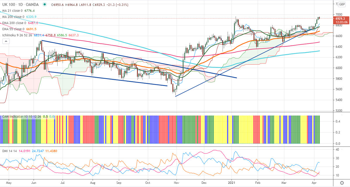 FTSE100 has formed a double top around 6960 and shows a minor decline from that level. The global economic recovery and positive vaccine rollout in major countries are supporting the global markets. The U.S markets hit a fresh all-time high as US bond yields have fallen. The US 10-year yield lost more than 9% from a minor top 1.77%. The FTSE100 hits fresh pandemic high as more than 5 million people got second dose vaccination in the UK. FTSE100 hits an intraday high of 6964 and currently trading around 6928.90.