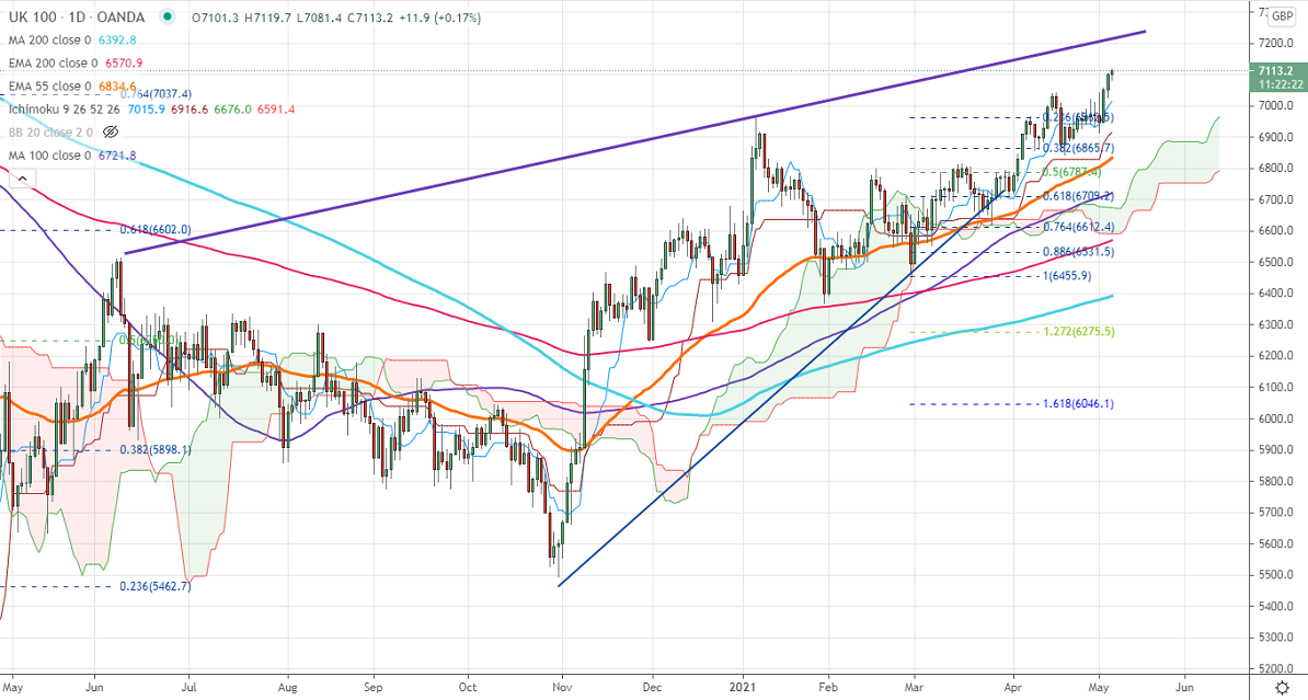 FTSE100 continues to trade higher for third consecutive days and back to pre-pandemic levels. The positive earnings from Next and Melrose and BOE monetary policy are the main reason for FTSE100 to close above 7000 levels. The Bank of England has kept its rates unchanged as expected and slowed its bond-buying program of 3.4 billion a week from its current pace of 4.4 billion pounds a week. It has revised up the economic forecast for 2021 and 2022. The upbeat market sentiment and positive US economic data also supporting global markets. The FTSE100 hits a fresh pandemic high of 7115 and currently trading around 7111.