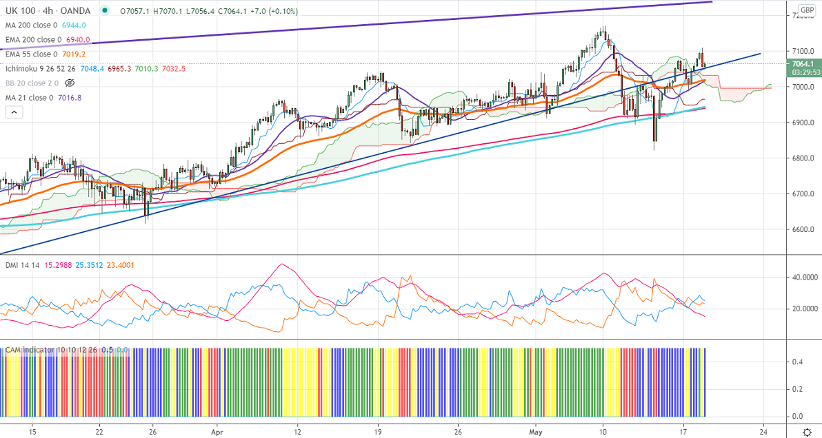 FTSE100 recovered sharply after hitting a low of 6822 on upbeat market sentiment. The decrease in coronavirus new cases and deaths in the United Kingdom is pushing the index higher. The UK government has eased restrictions yesterday. The European stocks are trading higher supported by dovish Fed members and upbeat UK jobs data. The Claimant count change came at -15.1K compared to a forecast of 25.6K and unemployment declined to 4.8% vs 4.9%. FTSE100 should break above channel resistance 7220 for further bullishness. The FTSE100 hits an intraday high of 7108 and currently trading around 7064.