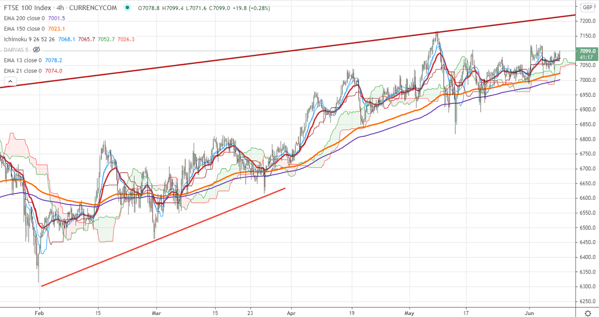 FTSE100 has shown a minor pullback from a low of 7037 as housing stocks jumped on the upbeat Halifax price index. It came at 1.3%less than the forecast of 1%. The delay in reopening of lockdown due to the spread of the Indian corona variant is also putting pressure on the index. The US indices have closed mixed with Dow jones lost nearly 0.36%. FTSE100 should break above channel resistance 7230 for further bullishness. The FTSE100 hits an intraday high of 7099 and currently trading around 7098.60.