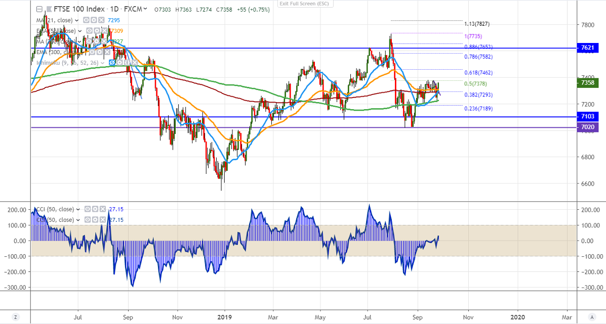 FTSE100 ha taken support near 200- day MA and shown massive recovery. The jump was mainly due to weak pound sterling and positive US markets. Markets eye US-China trade talks which are to happen in 2 weeks for further direction. It hits an intraday high of 7355 and is currently around 7353. The yield curve has inverted and spread is narrowed to 0.60 bps.