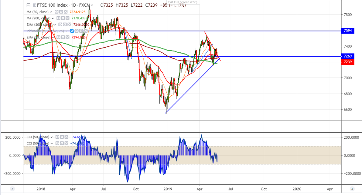 FTSE100 trading weak for past two days and lost more than 100 points on ongoing Brexit news. UK PM Theresa May is expected to step down if conservative party looses in election happening in Europe.Eurpoean election latest polls forecasts shows that Brexit party likely to gain the most votes in the UK. It hits low of 7222 and is currently trading around 7252.