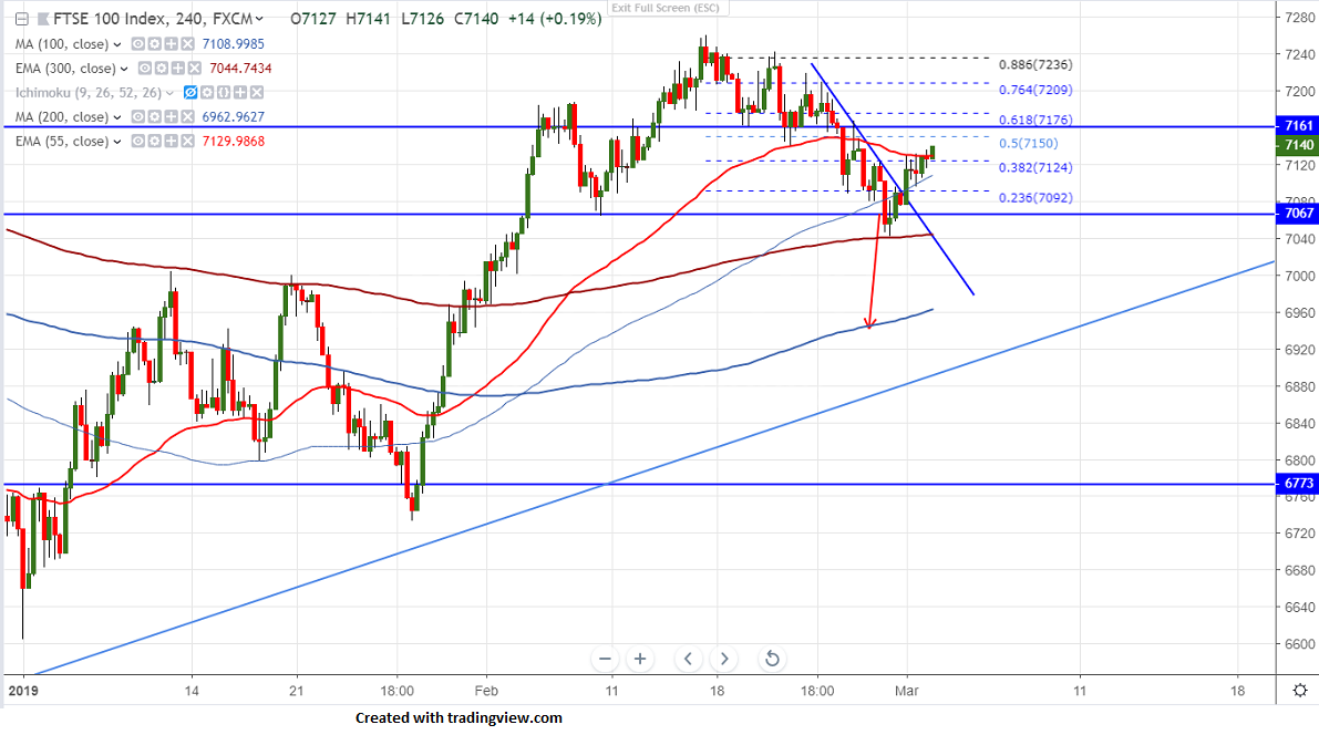 FTSE100 has halted its 2 week of weakness and jumped more than 90 points from the low of 7042 made yesterday. The index was trading weak and lost more than 3% after forming temporary top around 7262. The decline was mainly due to strong recovery in pound sterling on hopes of Brexit delay. The index hits intraday high of 7139 on account of US-China trade deal optimism and is currently trading around 7138.