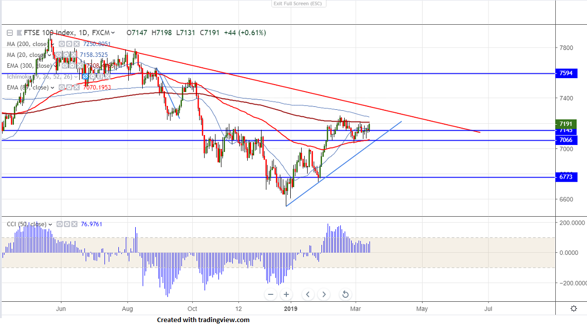 FTSE100 has formed a double bottom around 7075 and shown a massive recover. The index is trading in narrow range between 7042 and 7215 for past 10 trading day. The Brexit uncertainty is major factor which is putting pressure on FTSE100. UK Parliament has rejected no deal Brexit and voted by 312 to 308 a margin of four.Overall GBP was trading strong especially against USD and jumped more than 400 pips from low of 1.29600.