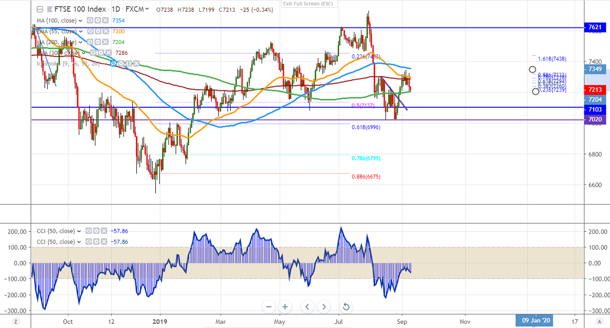 FTSE100 continues to trade lower for 5th consecutive days and lost more than 140 points on account of the strong Pound sterling. GBP hits a 6-week top against USD on better than expected UK data and slight optimism in the Brexit deal. The GDP came at 0.3% compared to a forecast of 0.1% which confirms that the chance of recession is low. It hits low of 7204 and is currently trading around 7212.