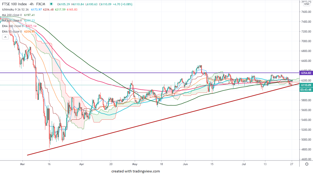 FTSE100 is trading weak for 2nd consecutive week on an escalation of the US-China trade war and an increase in coronavirus cases in Europe. The UK said that it would quarantine all people who travel from Spain as the number of cases increased. The S&P futures are trading slightly higher and is currently trading around 3215.