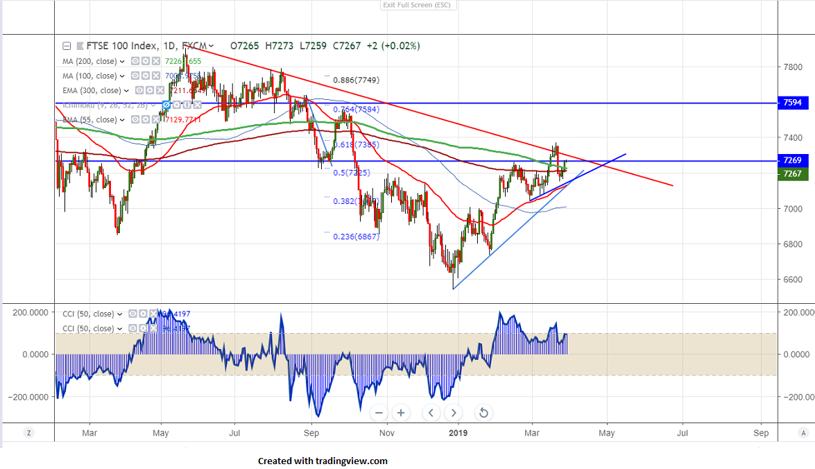 FTSE100 trades higher and jumped more than 60 points from yesterday’s low of 7204. Global markets has shown a major sell-off in starting of the week on account of yield curve inversion. The yield curve inversion has increased fear of recession. UK members of parliament to vote on Friday for 3rd time to approve for the 585 page-long withdrawal agreement agreed by negotiators from UK and EU last year. The index hits high of 7273 and is currently trading around 7276.