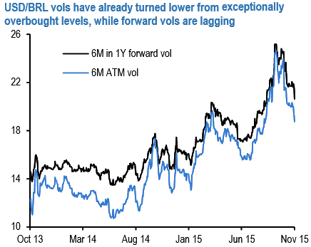 ATM vols in USD/BRL have already turned lower from remarkably overbought levels aided by soft realized performance in recent weeks (3-4 pts. under) yet forward vols are lagging and are priced 2-2.5 vols above.