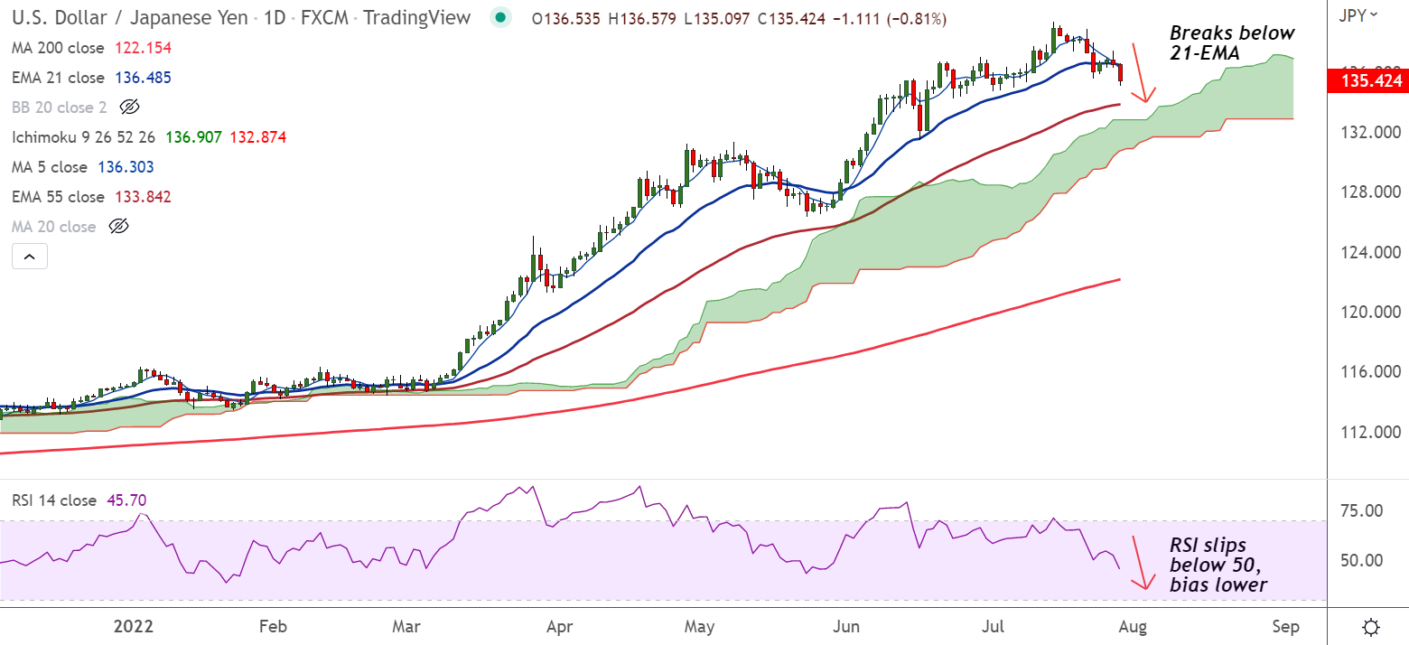 - USD/JPY slumps below 21-EMA, eyes 55-EMA support at 133.84