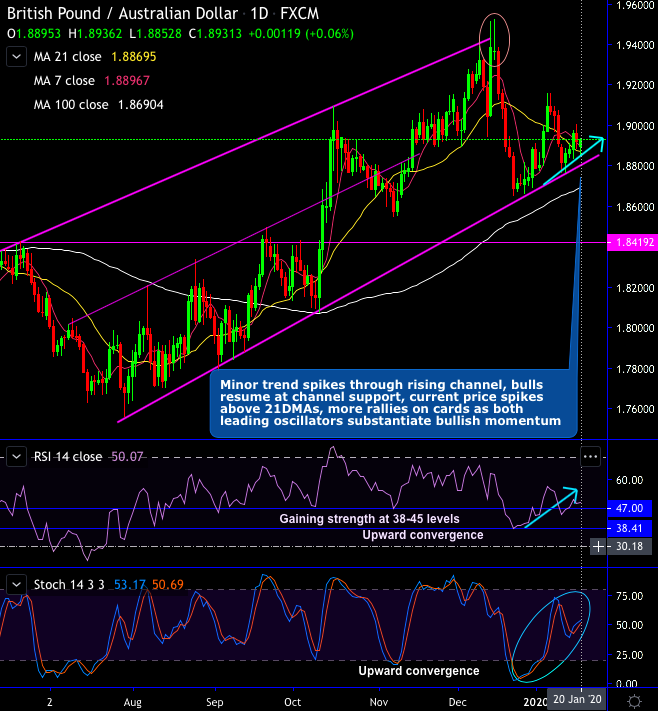After brief halt during last weekend, GBPAUD resumes its bullish rout above 1.89 levels, the pair is currently trading 1.8930 level.