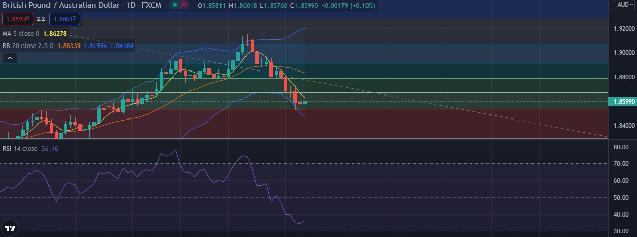 • Immediate support is seen at 1.8528 (23.6%fib) and break below could take the pair towards 1.8469(Lower BB).