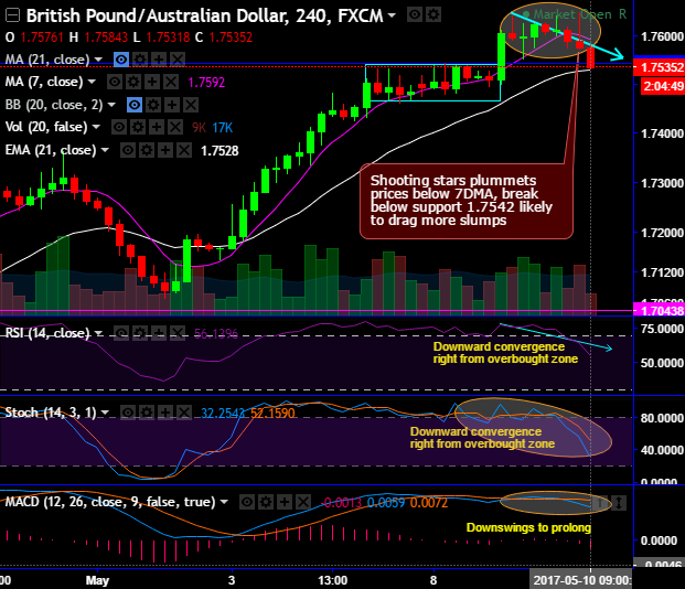 Consequently, the bears managed to evidence price dips below 7SMAs, next strong support are seen at 1.7542 and 1.7529 range.