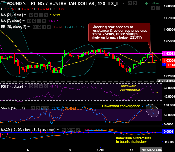 On 2H charts, shooting star appears at resistance & evidences price dips below 7SMAs, more slumps likely on the breach below 21SMA.